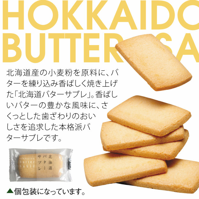 北海道産の小麦粉を原料に、バターを練り込み香ばしく焼き上げた「北海道バターサブレ」。香ばしいバターの豊かな風味に、さくっとした歯ざわりのおいしさを追求した本格派バターサブレです。